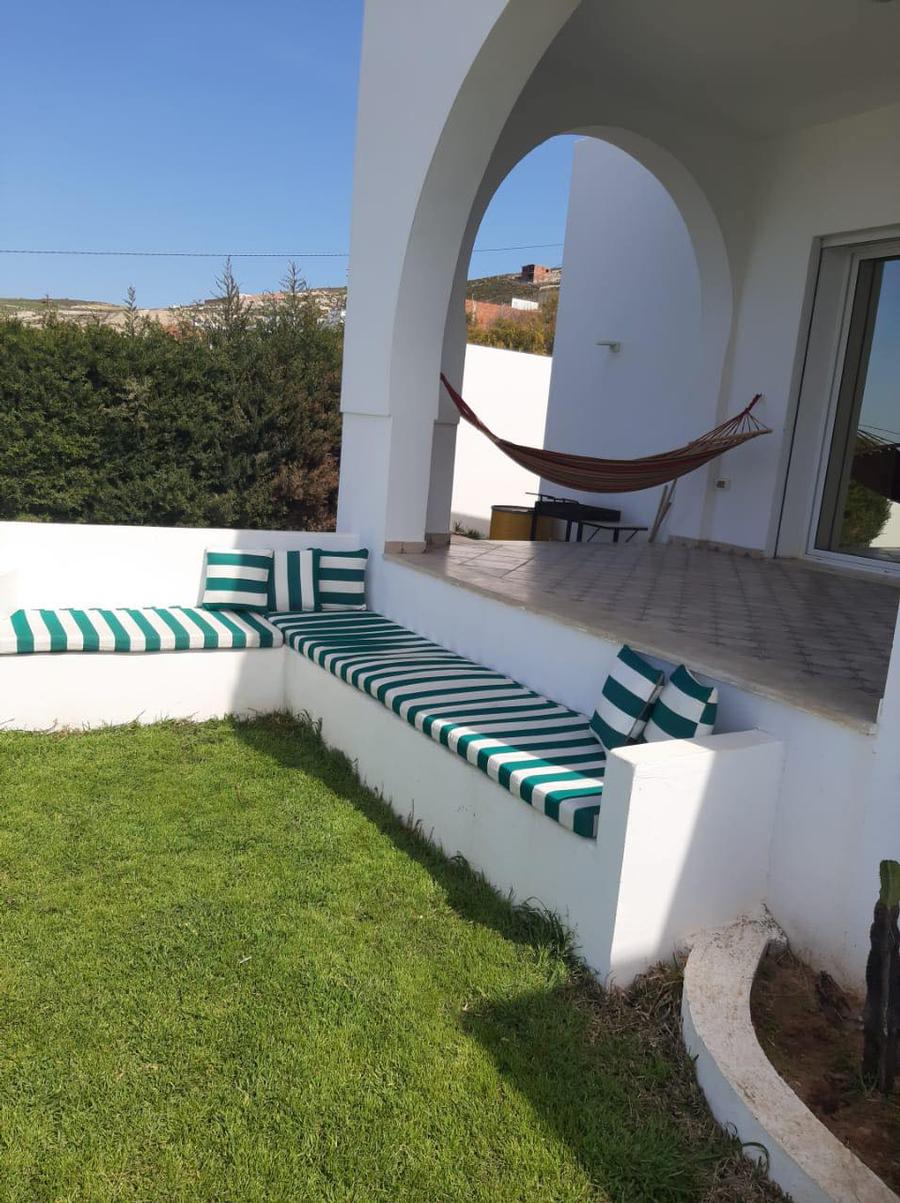 un salon de jardin équipé ( parasol, barbecue, douche extérieure)