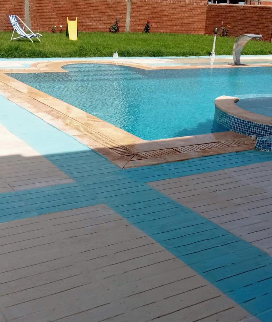 Un grand salon lumineux donnant directement sur une terrasse avec un très grand jardin de 1200 mètres bien entretenu et une large piscine privée avec un jacuzzi